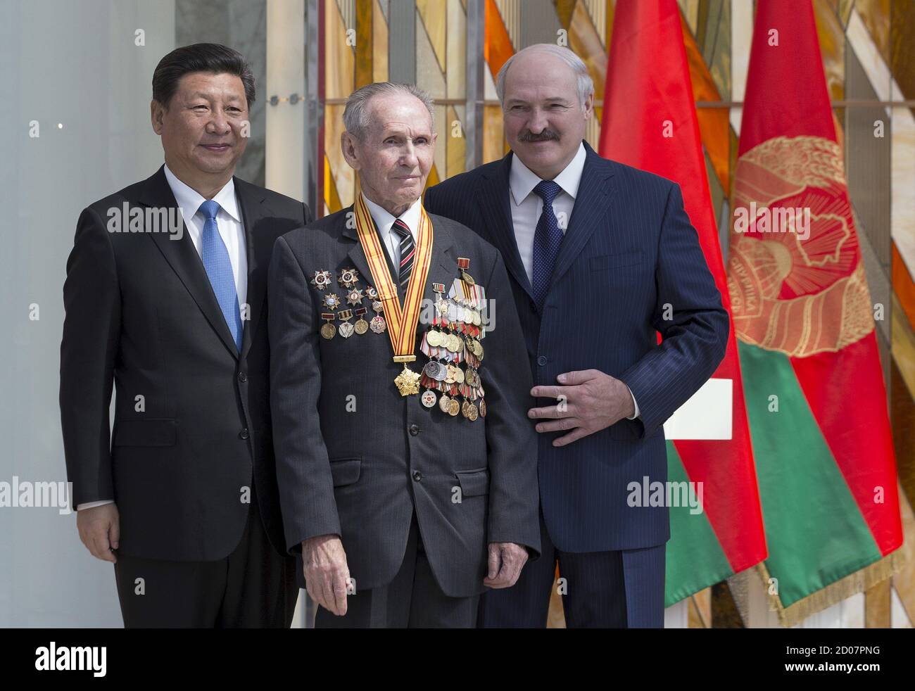 Belarus President Alexander Lukashenko R And His Chinese Counterpart Xi Jinping L Pose For A Photo With Veteran Aleksey Detsik 88 During An Award Ceremony For Veterans In The World War Two
